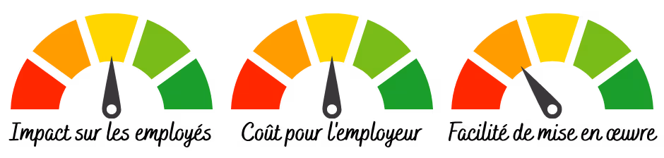 Avant d’entrer dans le détail, il est important de rappeler que tous les avantages ne se valent pas. Chaque solution combine différemment valeur pour l’employé, coût pour l’employeur et complexité de mise en œuvre. Afin de faciliter la comparaison, nous utilisons un système de scoring pratique permettant d’identifier les options offrant le plus d’impact tout en restant réalistes à implémenter.