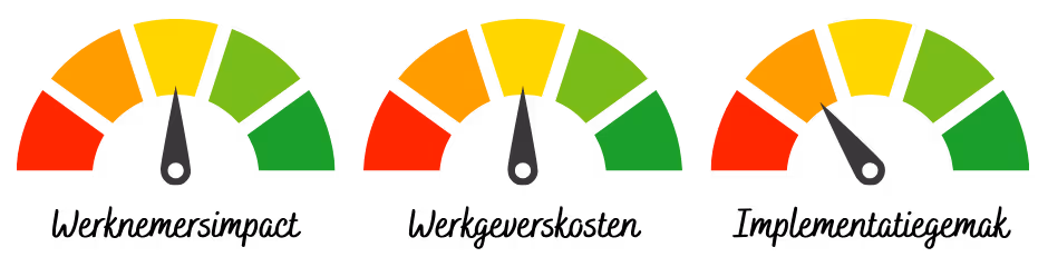 Niet alle voordelen zijn gelijk. Elke oplossing combineert een andere mate van werknemerswaarde, kostenimpact en complexiteit in implementatie. Om vergelijking mogelijk te maken, hanteren we een praktisch scoresysteem dat duidelijk maakt welke opties het meeste effect hebben én realistisch implementeerbaar zijn.